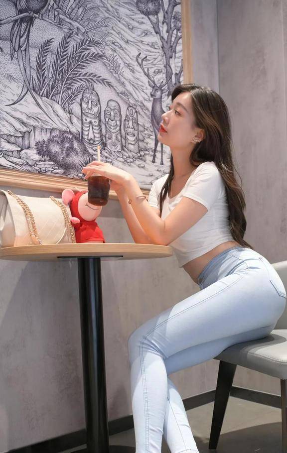 — 白色小上衣搭配牛仔喇叭裤,戴上耀眼的小脐钉,充满辣妹风格 —