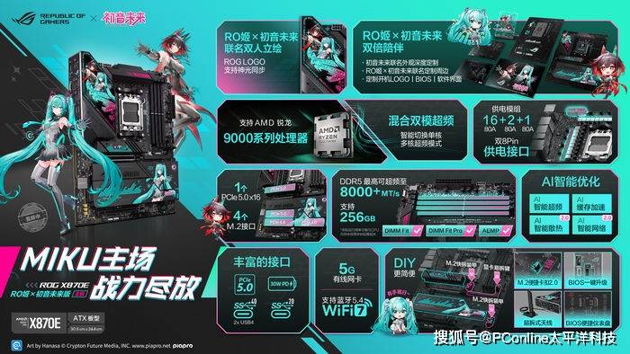ROG X870E RO姬×初音未来版主板以初音未来和RO姬为设计原型,大面积装甲上加入初音未来标志性苍绿色,并巧妙融入诸多初音未来相关元素。IO装甲区域尤为瞩目,不仅有MIKU和RO姬双人同框涂装,ROG LOGO更支持神光同步,氛围感十足。M.2快拆装甲上有MIKU和RO姬的点阵图案,芯片组散热片也增加初音未来立绘和01标识,辅以音频律动纹饰,甚至主板背后都有双人剪影和元素,心动指数爆棚。从开机瞬间,就有RO姬和MIKU陪伴,BIOS和软件UI均融入MIKU和RO姬身影。附赠双人同框亚克力手机支架、感谢卡及贴纸,轻松打造专属次元空间。性能方面毫不妥协,采用强悍供电,加上混合双模超频和AI智能优化2.0,充分释放AMD锐龙9000处理器潜力。支持更高DDR5内存频率,提供更强战力。配备4个M.2接口、双USB4、WiFi 7和5G,疾速互联轻而易举。还有M.2快拆装甲、显卡易拆键、易拆式天线等EZ DIY设计,让装机更加轻松!