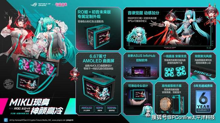 ROG 龙王4代 360 RO姬x初音未来版水冷搭载6.67英寸AMOLED曲面屏,支持2K分辨率+60Hz刷新率,显示效果出色;预设多支RO姬×初音未来动画,采用初音未来联动专属苍绿&粉红色主题定制外观设计,并搭载双侧发光ARGB风扇,炫彩非凡,颜值巅峰!此外还采用了RO姬×初音未来联名ASUS InfoHub软件UI设计,全线定制,时刻感受初音未来伴你左右的奇妙体验。散热效果方面,这款水冷可轻松压制旗舰级CPU的高发热量,全程保障畅玩体验,同时还采用预涂硅脂设计,搭配菊花链风扇一线直连,轻松上手DIY。