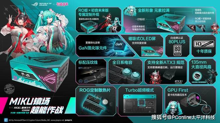 ROG 雷神3代 1200W RO姬x初音未来版电源整体采用全新形象设计,初音未来联动专属苍绿&粉红色搭配RO姬&初音未来双立绘铭板,眼前一亮。这款电源还配备了磁吸式OLED屏幕,不仅能够直观展现系统负载情况,支持双面安装,同时还预设了RO姬×初音未来联动专属开机动画,MIKU的可爱暴击近在眼前。这款电源采用了氮化镓元件并配备全日系电容,可提供更高的转化效率,并大幅降低发热,稳定性+静音效果MAX!此外还支持ATX 3.0及3.1规范,通过80 PLUS白金牌认证,并采用GPU First显卡优先稳压技术,为玩家们的每一次二次元之旅保驾护航!