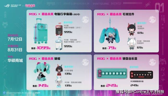 本次发布会上还带来了ROG x 初音未来电脑行李痛箱(20寸)、ROG x 初音未来毛绒挂件、ROG x 初音未来键帽和ROG x 初音未来键盘音乐盒等周边,7月12日12:00在华硕商城和B站会员购同步开启预约。