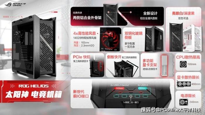 ROG太阳神机箱焕新升级归来,在设计方面更加强调散热实力,搭载强度更高、通风效率更出色的铝合金前面板,并附赠了4支升级版14028特规加厚风扇,全面加强散热效果,保障主机硬件安全。同时还延续了太阳神系列的经典双侧铝合金外骨架+双侧钢化玻璃设计,并提供深邃黑、亮眼白双配色版本可选,全面适配玩家们不同的桌搭风格,并提供炫彩高颜值表现。ROG太阳神机箱还支持PCIe快扣、侧板快开等功能,并配备多功能显卡支架;同时还支持安装E-ATX主板、45cm长度以内显卡及360冷排等硬件,搭配新世代前IO接口设计,助力玩家轻松玩转DIY。