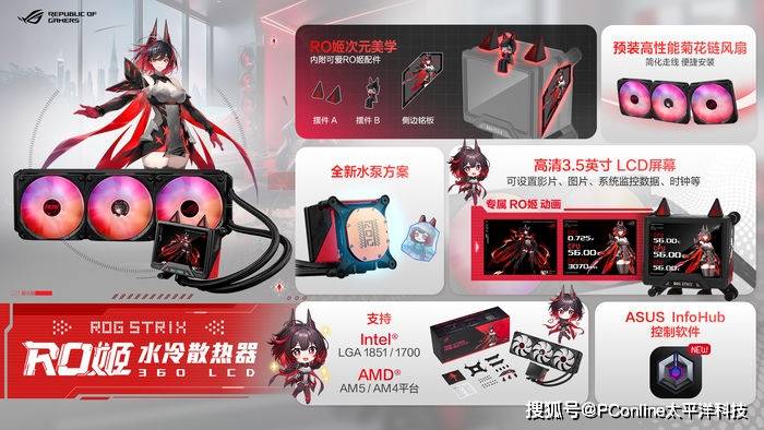 RO姬 360 LCD 水冷散热器采用了全新的水泵方案,全面加入RO姬次元美学视觉元素,提供了丰富的RO姬配件,为玩家提供沉浸式的RO姬陪伴体验。散热器的水冷头部分搭载了3.5英寸高清LCD屏幕,可自由设置显示内容,提供强大的个性化选择。此外,散热器搭载的风扇也采用了菊链式设计,不但简化了安装,也减少了走线,让机箱内部更加整洁。散热器支持现有主流平台,方便玩家打造各种MOD主机。