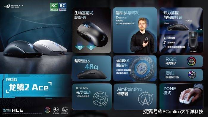 《无畏契约》2023年冠军巡回赛MVP,Demon1参与研发的ROG 龙鳞2 ACE配备生物基尼龙超轻外壳,48g超轻量化设计,采用V型收腰、延伸侧裙并精准调节鼠标背部倾斜度,专为抓握与指握打造。这款鼠标无线直连无需回报率加速器即可实现高达8K的回报率,搭载第二代ROG光学微动,拥有1亿次点击寿命,配备AimPointPro传感器,支持ZONE模式,提供极致电竞享受。