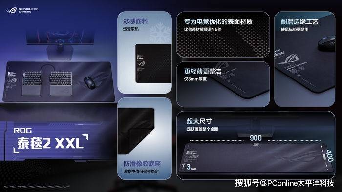 ROG泰毯2 XXL的尺寸达到900mm×400mm,可以完美覆盖整个电竞桌面操作区域,同时它还采用了冰感面料,可以迅速散热,提供更好的使用体验。此外,它使用的表面材质转为电竞优化,比普通材质顺滑1.5倍,而整个鼠标垫的厚度仅有3mm,轻薄又整洁。它采用了耐磨边缘工艺,还配备了防滑橡胶底座,即便是激烈的战斗,也能保持稳定。