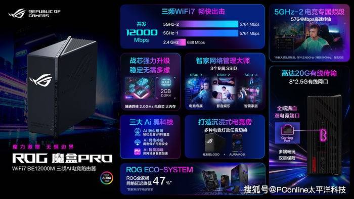 ROG 魔盒PRO 三频Ai电竞路由器焕芯而来,秉承系列线条凌厉的机身,配备全新升级的博通4核2.GHz处理器,保障电竞网络稳定丝滑;三频WIFI7无线速率激增至12000Mbps!更有智家网络管理大师:游戏电竞、影音娱乐、智能家居专网专用、一网打尽;ROG全家桶搭配ECO-SYSTEM网络延迟更低47%;还有三大Ai黑科技:随心组网、网络神盾、智能加速保障全屋网络畅联无忧;除此之外更有ROG独创的外观DIY定制,为玩家提供独一无二的专属网络神器。