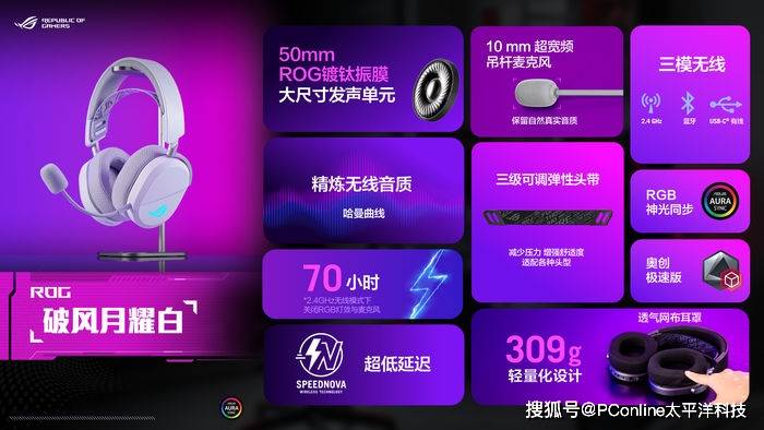 ROG破风「月耀白」新色登场,皎洁机身尽显质感,颜值更进一步。配备50mm ROG镀钛振膜大尺寸发声单元,搭配10mm超宽频吊杆麦克风,经过精心调校,提供出色音质。它还提供了三级可调弹性头带,透气网布耳罩,整体采用309g轻量化设计,佩戴更舒适。它支持三模无线连接,支持最高70小时续航,具备超低无线延迟,为玩家提供极致的无线电竞音效享受。