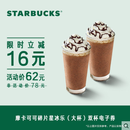 星巴克 摩卡可可碎片星冰乐大杯双杯券 限时立减16元! 阅读全文