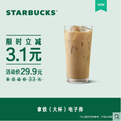 星巴克大杯拿铁电子券 限时立减3.1元! 阅读全文