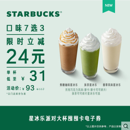 星巴克星冰乐派对大杯囤囤卡(3杯) 限时立减24元! 阅读全文