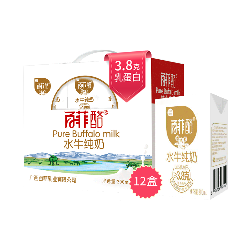 百菲酪水牛纯奶 整箱儿童学生成人营养早餐牛奶 200ml*12盒送礼礼盒装