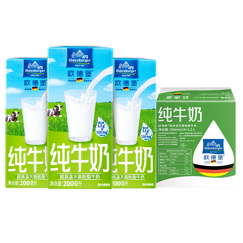 欧德堡(Oldenburger)德国DMK进口牛奶 脱脂纯牛奶200ml*16盒 早餐奶 高钙奶 整箱装
