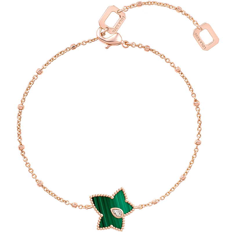 LOLA ROSE 罗拉玫瑰 常青藤孔雀石手链 LR80038,孔雀石切割呈现常青藤造型,色彩明媚,清新灵动。小巧钉珠环绕常青藤叶片,勾勒立体轮廓,显露精致细节。梨形合成立方氧化锆镶嵌,多面切割,呈现耀眼光泽。 阅读全文 -