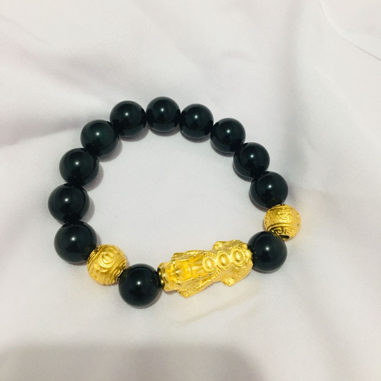 天然七彩黑曜石手串男越南沙金貔貅手链999仿真黄金色转运珠 38元