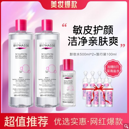 BYPHASSE【1000ml+旅行装/湿巾/卸妆棉】深层清洁温和卸妆水套装 买指定商品即送深海盐水8支,数量有限,送完即止(07月18日1
