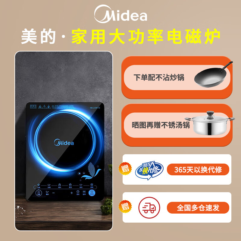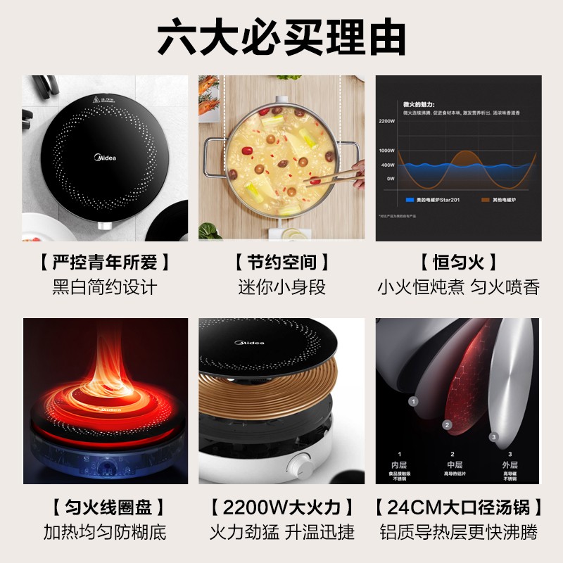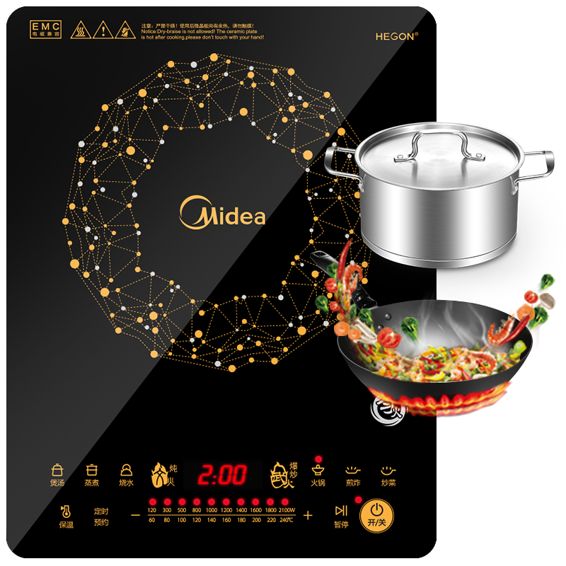 美的(Midea)电磁炉 火锅炉匀火 智能定时 十档火力 C21-WT2118(标配欧式汤锅+炒锅)