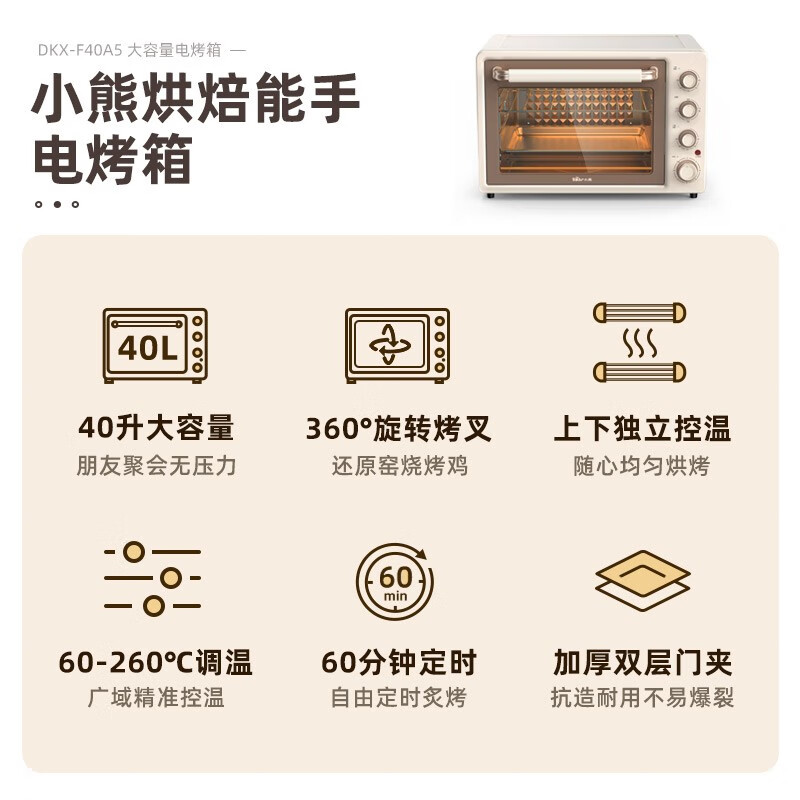 小熊(Bear) 电烤箱 烤箱家用40L大容量 烘焙蛋糕小家电旋钮上下独立控温 带旋转烤叉 DKX-F40A5