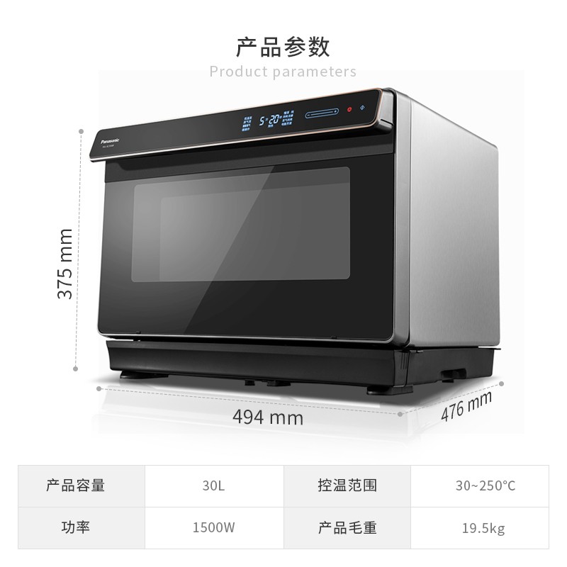 松下 NU-SC300B 蒸烤箱 ,具有30L容量。蒸烤二合一,可选择多重蒸汽模式,适应烹饪不同食材。烘烤功能,可设置上下热管发热,100-250摄氏度范围可调。采用下拉开门方式。机身尺寸为494×476×375mm,重量19.5kg。 这款松下(Panasonic)NU-SC300B XPE蒸烤箱,支持蒸、烤、炸、煎、发酵、烘焙、蒸汽烤以及汤炖盅等多种烹饪模式,采用了高温蒸汽、热风循环烘烤以及蜂窝拱形平面烘烤加热等技术。此款蒸烤箱有着30升容量,平顶炉腔,3档烤层,适合大家庭使用,满足多种烘烤需求。蒸烤箱可以通过WIFI连接松下智能家电APP,可远程操控,随时查看烹饪状态,还支持一键购买食材。内置30道电脑预设菜单,三档高温蒸汽,其中120℃健康蒸汽适合烹饪紫薯、红薯以及其他薯类蔬菜;150℃健康蒸汽适合烹饪鱼虾等海鲜食材;190℃健康蒸汽则是鸡、鸭、牛肉、猪肉等肉类食材的理想选择。设计方面,采用典雅简约外观,纯平钢化玻璃,暗藏式把手,触控操作、滑动感应,兼具科技感,带有儿童锁功能,可防止儿童误操作按键。产品还具有餐具清洁功能,可为餐具消毒除味。其他参数方面,蒸汽模式功率为1550W,烘烤模式功率为1350W,外形尺寸494 mm*476 mm*375 mm。 阅读全文