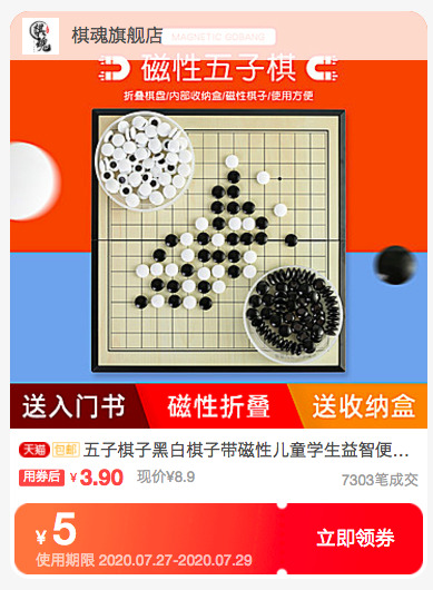 采用环保材质制作,安全无味,便携设计,老少皆宜~天猫品健运动旗舰店现有便携围棋套装,售价5.8元,可领取3元优惠券,实付2.8元包邮到手。 阅读全文