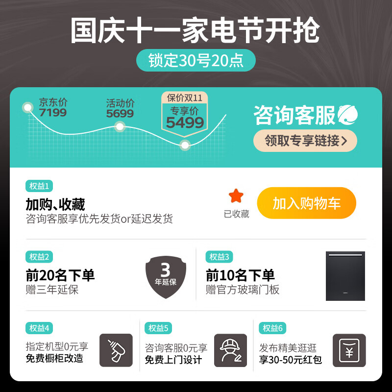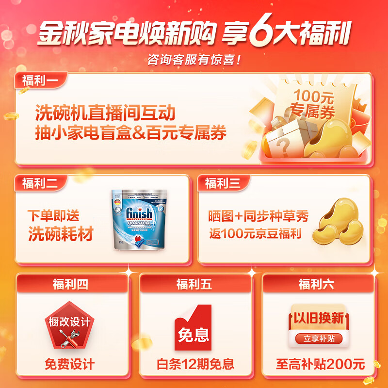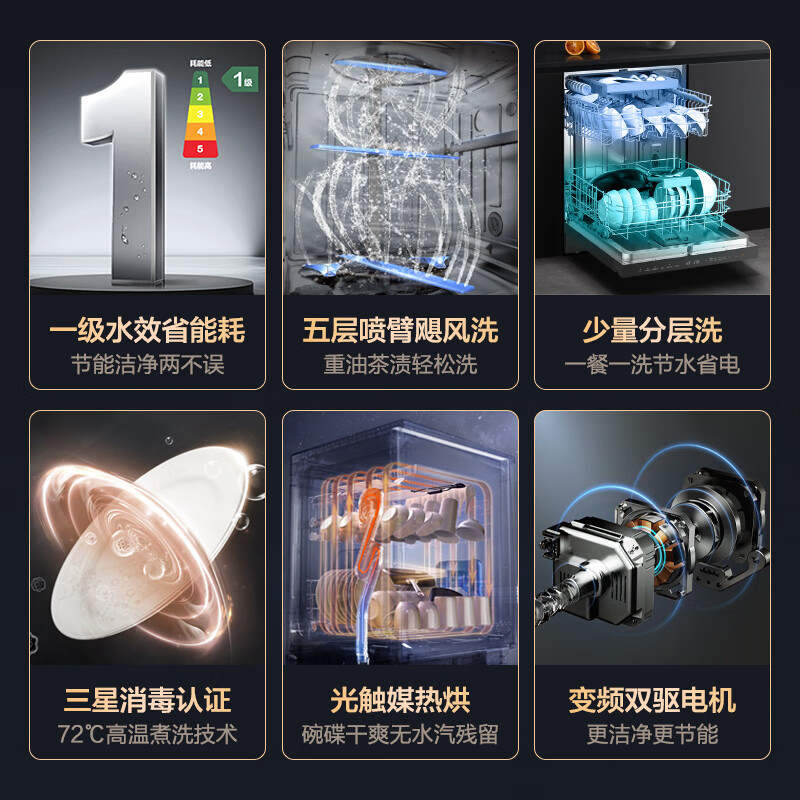 13套大容量,智能开门,10+6套洗涤模式,晶彩触控大屏,三层喷淋720°冲洗。