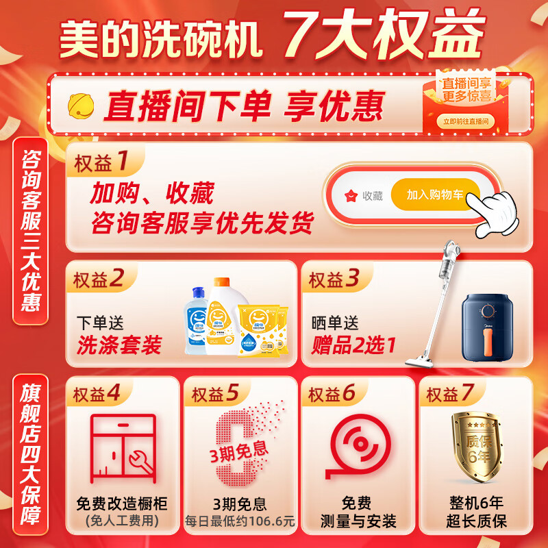 Midea 美的 WQP12-W5201N-CN-R(JV13)13套 洗碗机,775mm高度独嵌两用,适合中国家庭;13套大容量,锅碗瓢盆都放得下;双重热风烘干(在原有热风技术上升级叠加1-2个时序热风烘干),提升餐具和内壁全烘干效果,银离子除菌除味;一键智能测污,预冲洗果蔬,5+4种洗涤程序,24/72小时换气排湿,自清洗程序;触控屏操作,WiFi远程控制;产品尺寸597*605*780mm(带顶宽深高),581*601*775mm(不带顶深宽深高)。 阅读全文 -