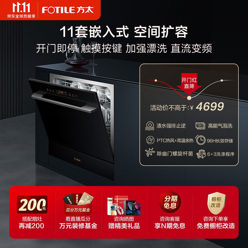 方太(FOTILE)这款型号为JPCD11E-NG01的洗碗机,其采用了嵌入式设计,外形采用了传统的8套式设计,但内部却拥有11套餐具的大容量设计,既能洗碗又能洗锅。产品采用了PTC加热模块+余热双重烘干模式,大家只要记得,往里面吹热风的烘干方式,效果肯定好。清洗后均匀恒温热风配合餐具高温漂洗后的余热,使灶腔体和碗碟迅速干爽,避免二次污染。这款洗碗机还支持洗完96小时超长抑菌存储,完全可以当消毒柜用了。这款洗碗机还有一个非常贴心的小功能,开门自动亮灯,超过一定时间还会自动关闭,不用担心你家厨房光线不足,需要取餐具时打开舱门灯就会自动亮了,无需开灯就能找到所需,真的非常贴心。采用水气混动2.0气泡洗涤技术,大量微气泡快速剥离油污,深层净透洗涤,餐具更洁净。 阅读全文