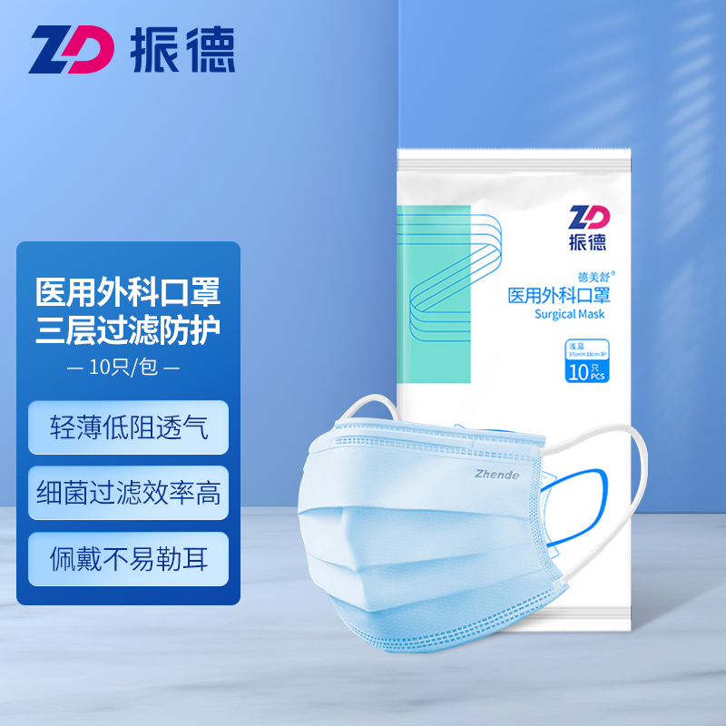 振德(ZHENDE)一次性医用外科口罩 非灭菌非独立浅蓝10只/包 浅蓝 防沙尘暴防飞沫防花粉(二类医疗器械)