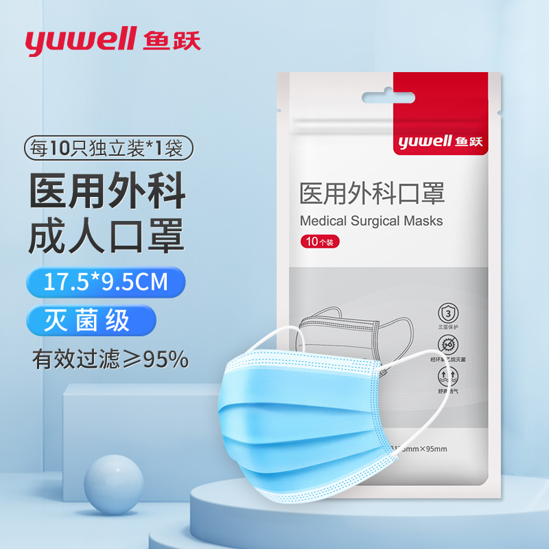 鱼跃(yuwell)成人10只一次性医用外科灭菌级医用口罩隔离挂耳式透气三层防护保暖口罩面罩(每10只独立装)