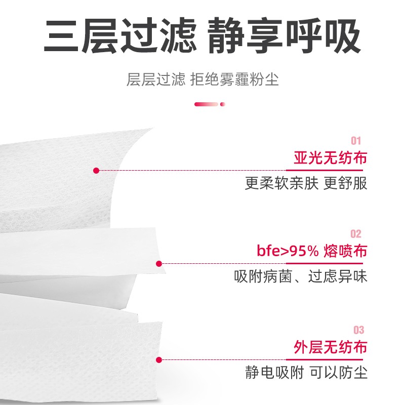 透气性好,提升时间长佩戴舒适性,高弹耳带,宽扁设计,顺畅呼吸,轻薄透气,无妨布棉内层 透气不闷,三层防护过滤,牢固防脱,超声波点焊,三层折叠,立体空间,细菌过滤效率95%。 阅读全文