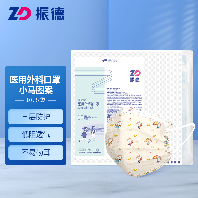 振德(ZHENDE)一次性医用外科口罩 学生儿童口罩6-12岁 灭菌米色小马100只 防粉尘柳絮沙尘男女童10只/包*10