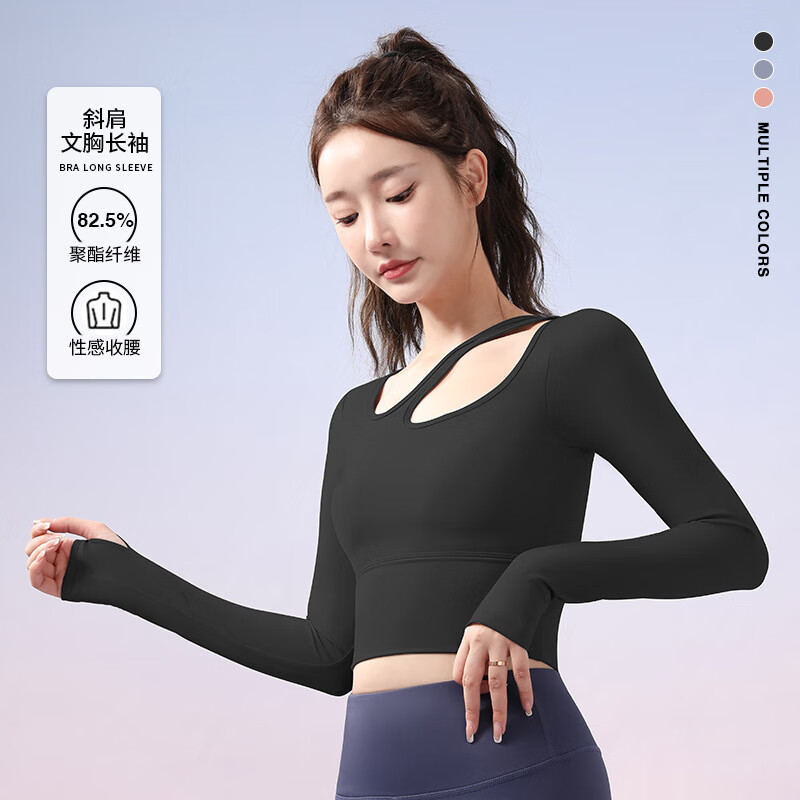 Rianne.He 斜肩带胸垫固定一体式圆领套头长袖健身跑步运动训练瑜伽服上衣 灰湖蓝 S
