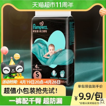 帮宝适黑金帮新生婴儿纸尿裤试用装S4 帮宝适蚕丝亲肤尿不湿试用装9.9元秒杀。