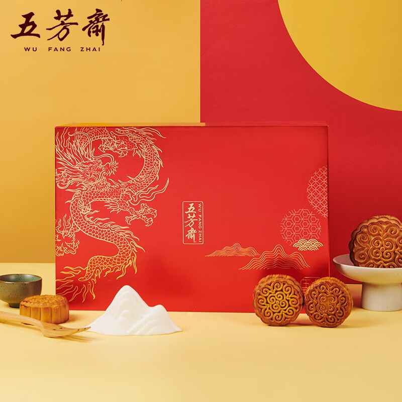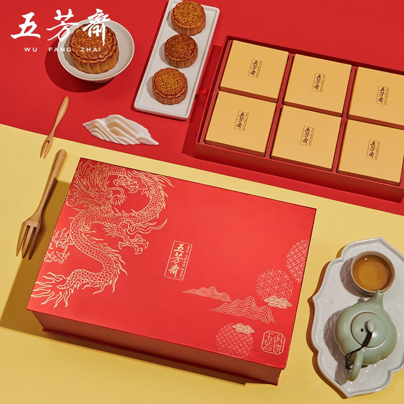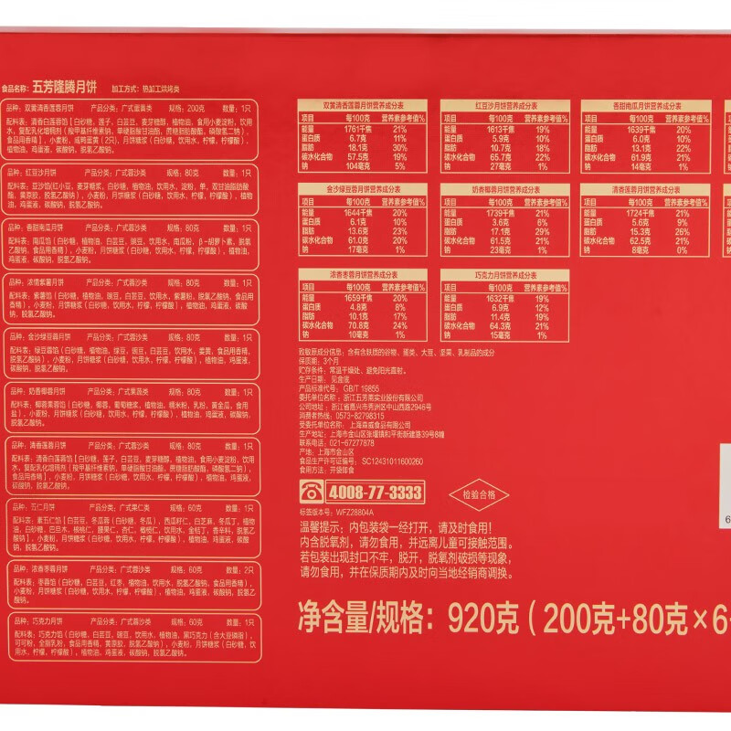 五芳隆腾月饼礼盒内含200克双黄清香莲蓉月饼、180g红豆沙月饼、80g清香莲蓉月饼、80g香甜南瓜月饼、180g浓情紫薯月饼、180g奶香椰蓉月饼、180g金沙绿豆蓉月饼、160g浓香枣蓉月饼、260g巧克力月饼、160g五仁月饼。