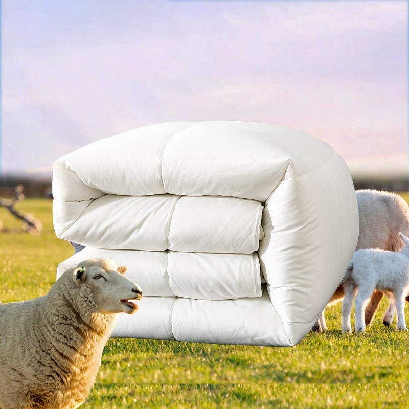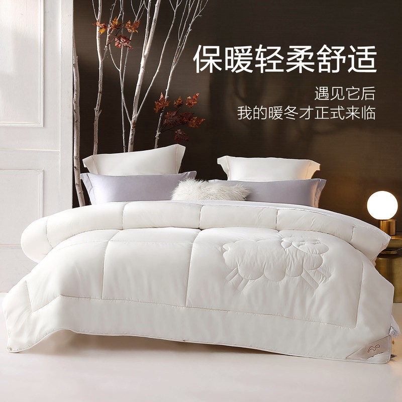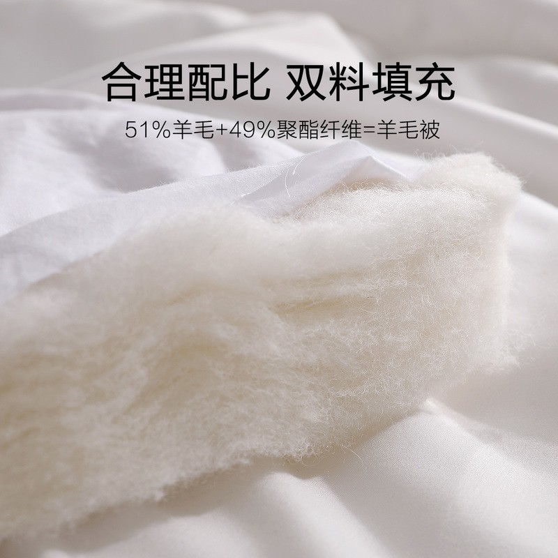此款羊毛被采用澳洲进口美利奴羊毛,纤维幼细柔韧,回弹性好,不易板结和钻毛。51%澳洲羊毛+49%聚酯纤维合理配比,高密度仿钻绒抗菌面料,简约衍缝。此款尺寸200*230cm:填充物重:2000g 产品净重:3400g