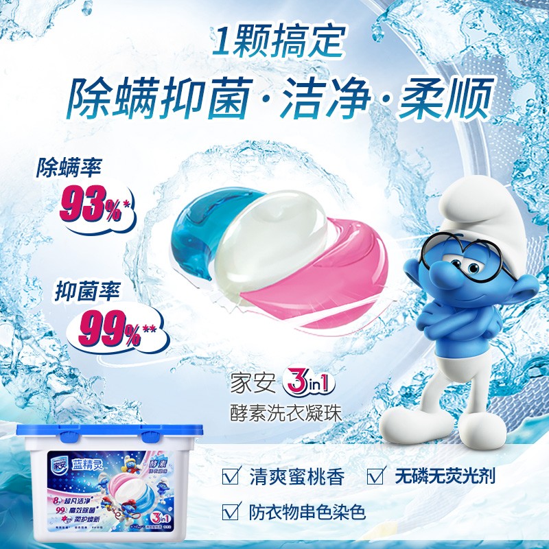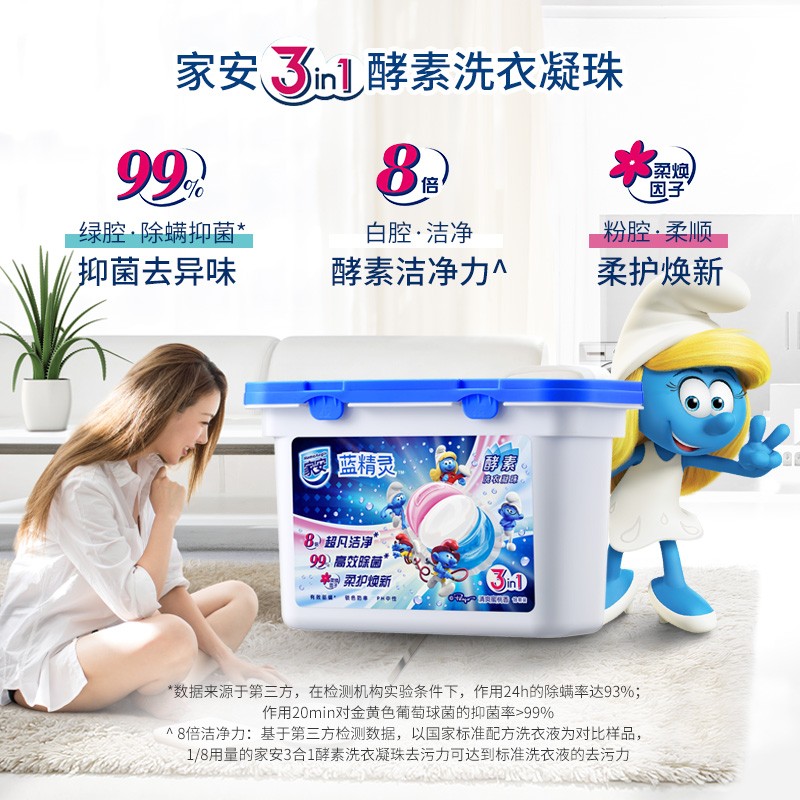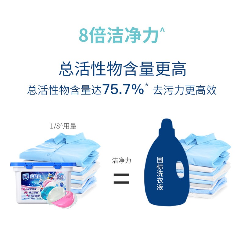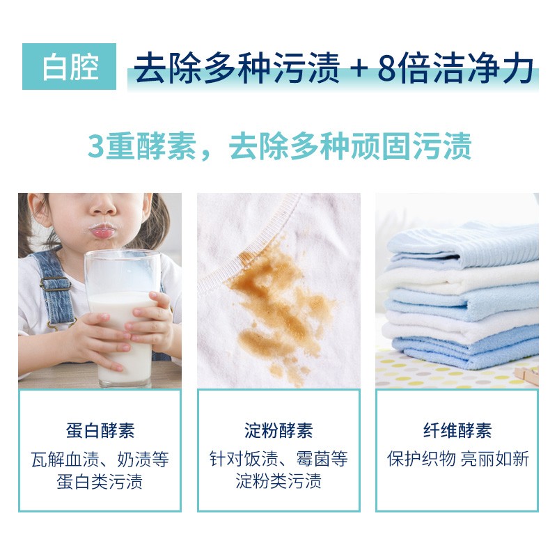 3重酵素,去除多种顽固污渍,去除多种污渍,8倍洁净力,总活性物含量达75.7%,去污力更高效,创新单颗密封技术,持续锁住酵素活性成分,特别添加衣物柔焕因子,洗后衣物保持柔软衣物亮丽如新,深入织物纤维,抑菌除螨。