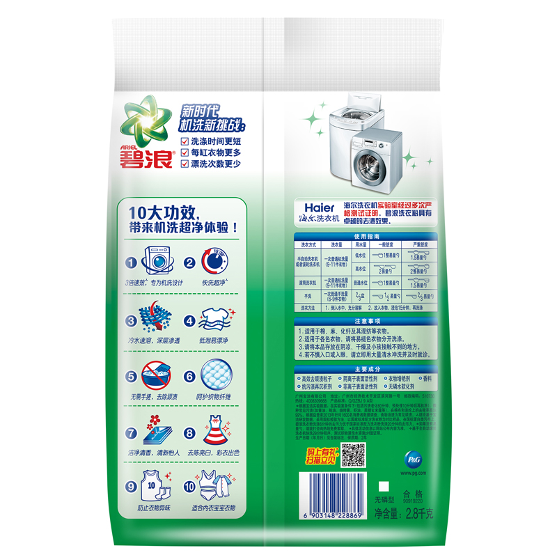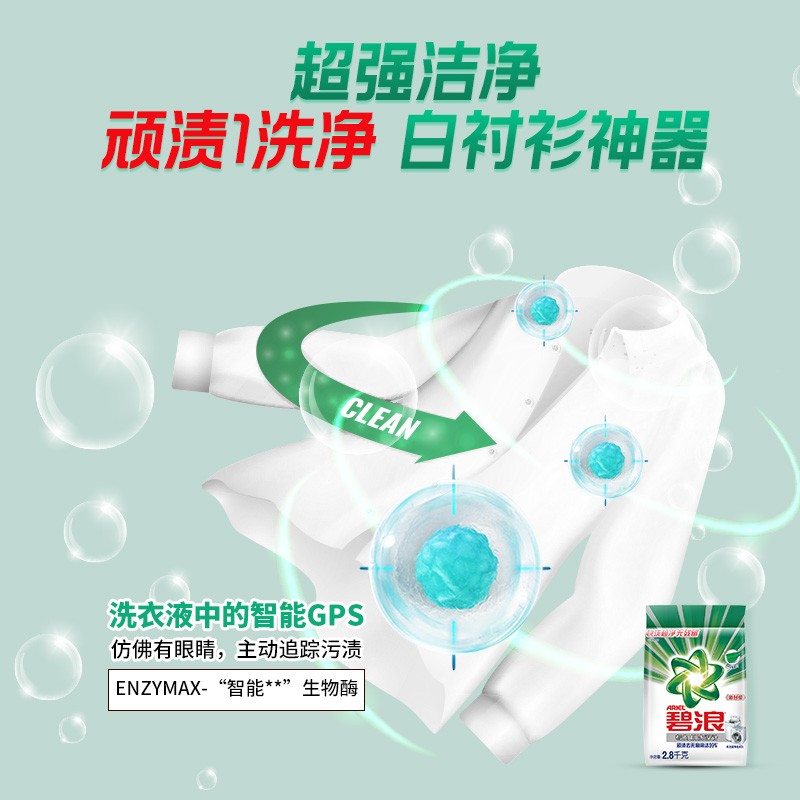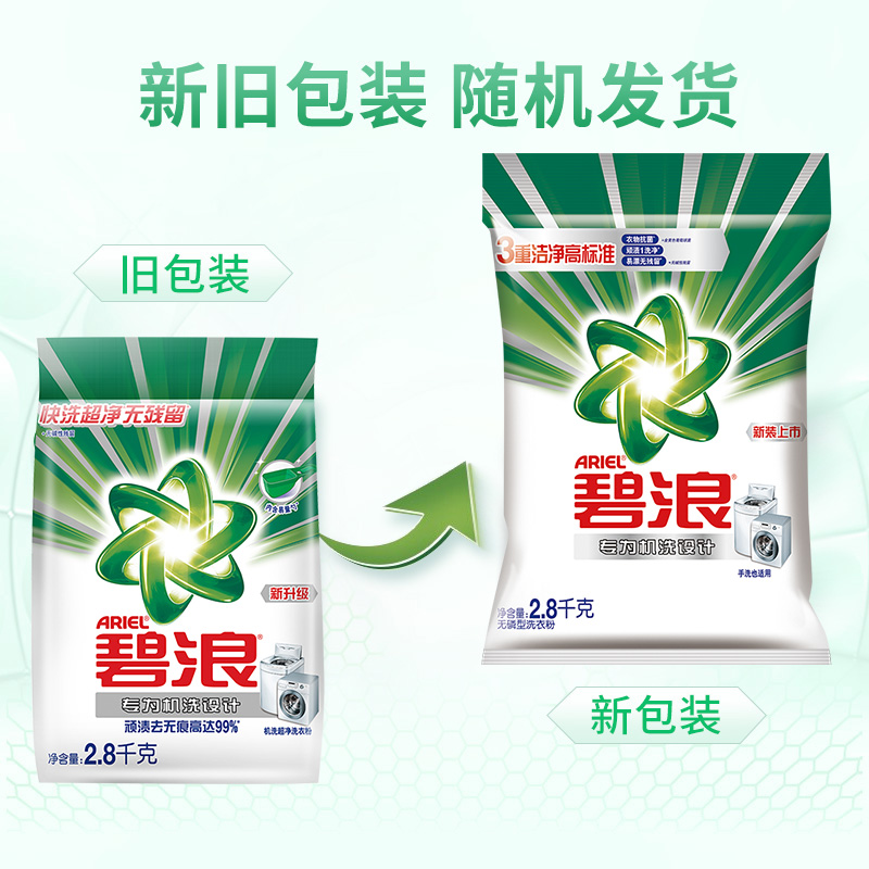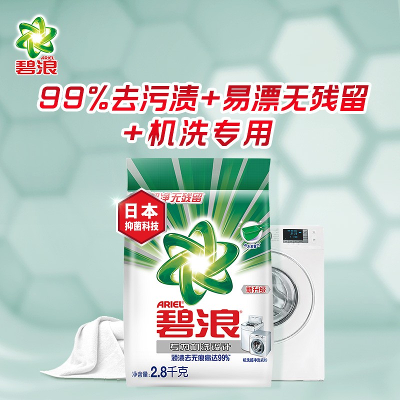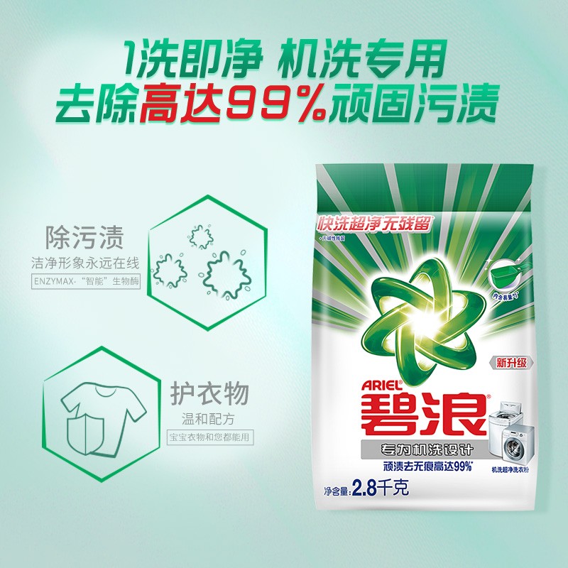ARIEL碧浪机洗专用洗衣液,低泡设计易溶易漂,适合棉麻、化纤等衣物,同时该款洗衣液质地温和,对双手也无刺激。规格2.8kg/袋。