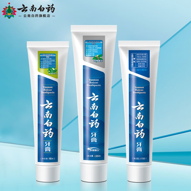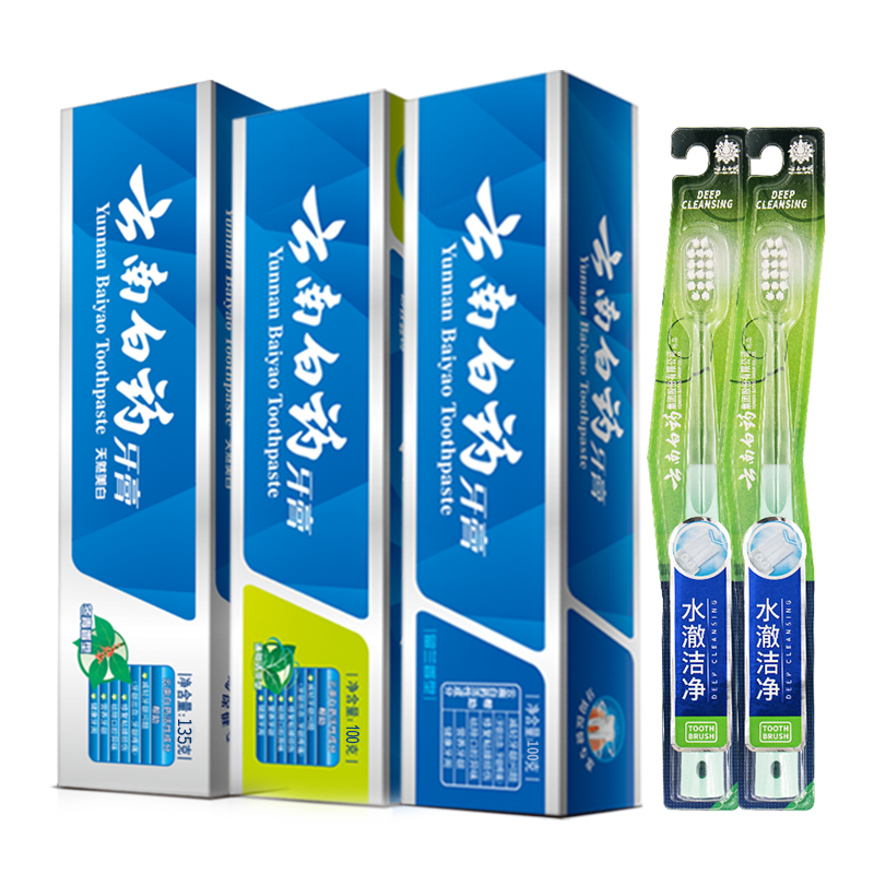 该套装包含3支云南白药牙膏和2个牙刷,牙膏含有特有的药物活性成分,能促进牙龈血液循环,长期使用可以防止牙龈出血,预防牙周炎、牙龈萎缩等口腔疾病。此款套餐牙膏含薄荷香型185g+留兰香型180g+冬青香型170g,可以满足家庭中不同人的需要。