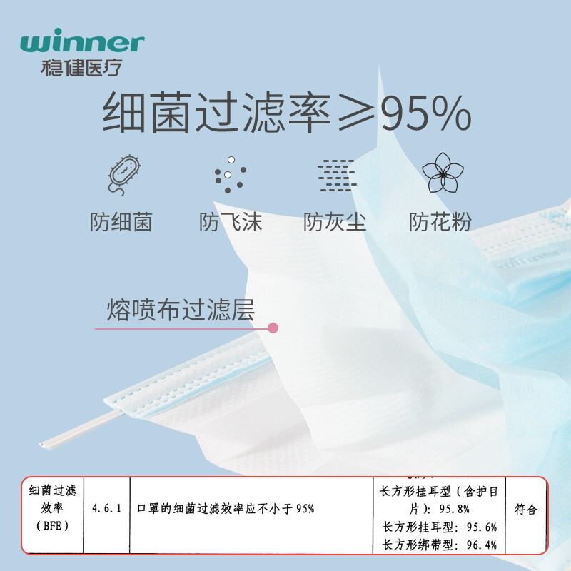 细菌过滤大于95%,三层防护更安心,一盒50只,满足一个月所需,符合YY0469-2011要求,三层防护,有效阻隔细菌病毒,全棉弹性带子,舒适不勒耳朵,外层透气无纺布,中层熔喷无纺布,有效过滤飞沫等可见物,过滤空气中的有害颗粒。