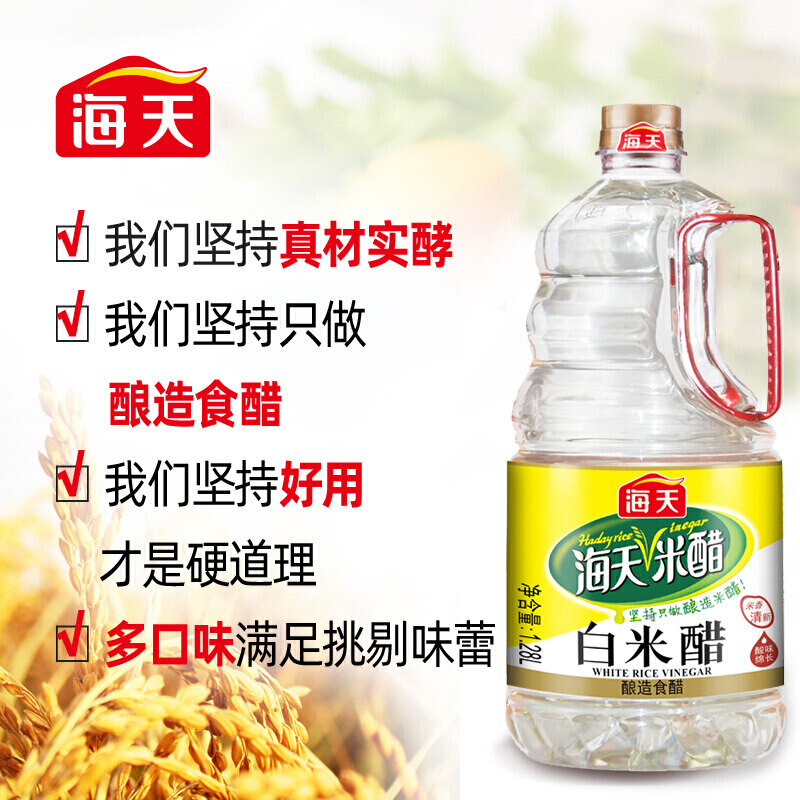 海天 白米醋,产地广东佛山。酱心传承,坚持只做酿造食醋,坚持真材实酵,只有用心才有美味,低酸度醋,清新的米香索饶舌尖。规格:1280ml。