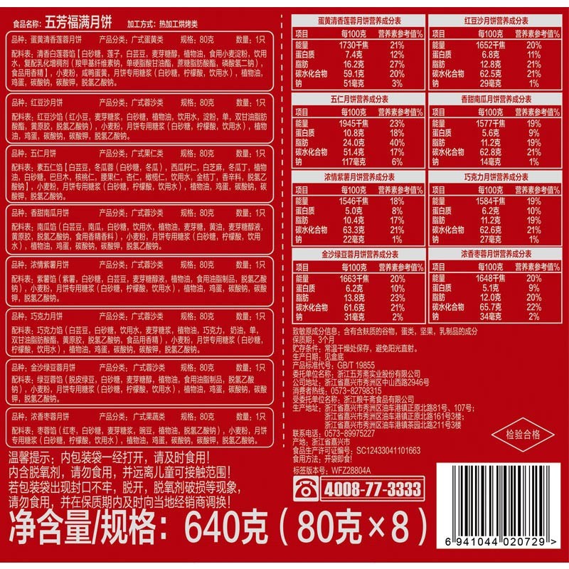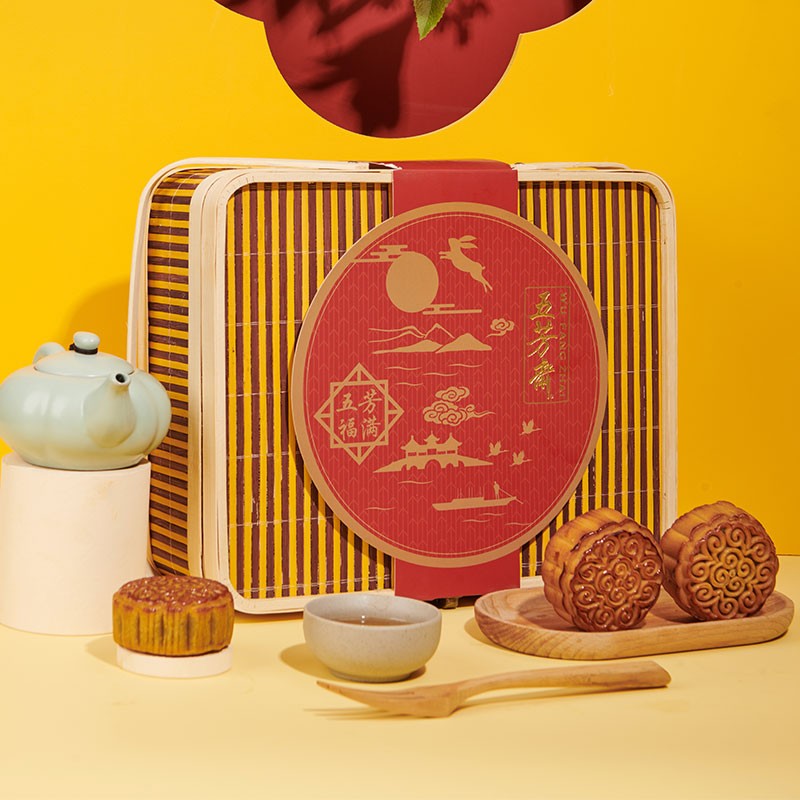 五芳斋作为商务部认定的首批“中华老字号”,创始于1921年,由浙江兰溪籍商人张锦泉在嘉兴城内张家弄开设了首家粽子店,其后又同嘉兴人冯昌年、朱庆堂两人开设的“五芳斋”合并形成为现在五芳斋的前身。取名“五芳斋”,寓意“五谷芳馨”,从创办以来百年,通过不断改进选料和配制方案,最终形成了这个享誉百年的中华老字号品牌。 五芳斋月饼,五芳福满,广式月饼竹篮礼盒,其中有80g蛋黄清香莲蓉月饼、80g红豆沙月饼、60g巧克力月饼、60g浓情紫薯月饼、60g金沙绿豆蓉月饼、60g清新抹茶月饼、60g香甜南瓜月饼、60g浓香枣蓉月饼,明月、好礼赠佳人,精致包装,送礼更体面!