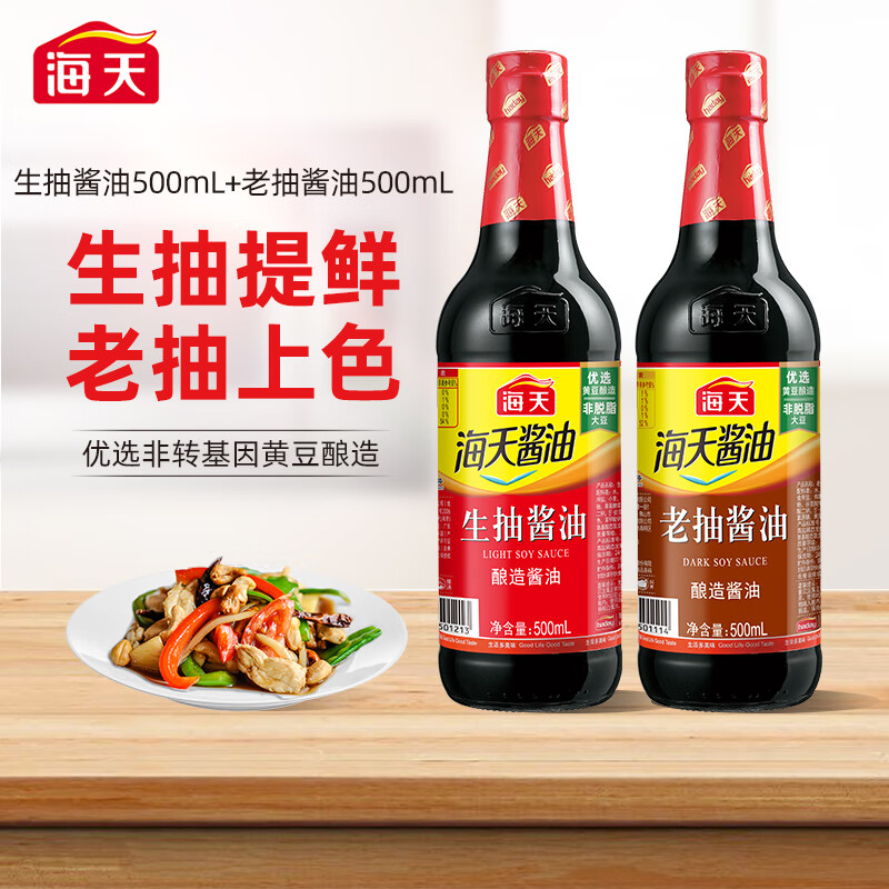 海天生抽酱油,鲜香美味,酱香浓郁,精选非转基因黄豆和优质冬小麦。产地位于北回归线附近,阳光直射时间更长,好酱油晒出来。用法多样,厨房好帮手。此款组合套装,更有多种调料搭配。