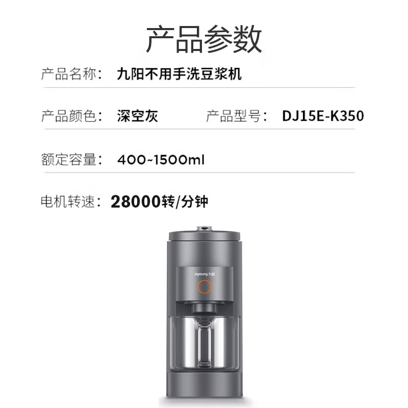 九阳天空系列K350免洗破壁机,搭载30000转电机,采用四叶锯齿刀,搭配双刀扰流内腔,充分搅动食材;容量400-1500mL可自由选择,支持1-6人饮用;支持免手洗功能,通过高压喷洗、高温蒸洗和高速搅洗实现自身清洁,清洗完后还会通过热烘10分钟可以实现99.9%除菌率;采用高硼硅玻璃杯,简易触控界面,顶盖可拆卸轻松加水。