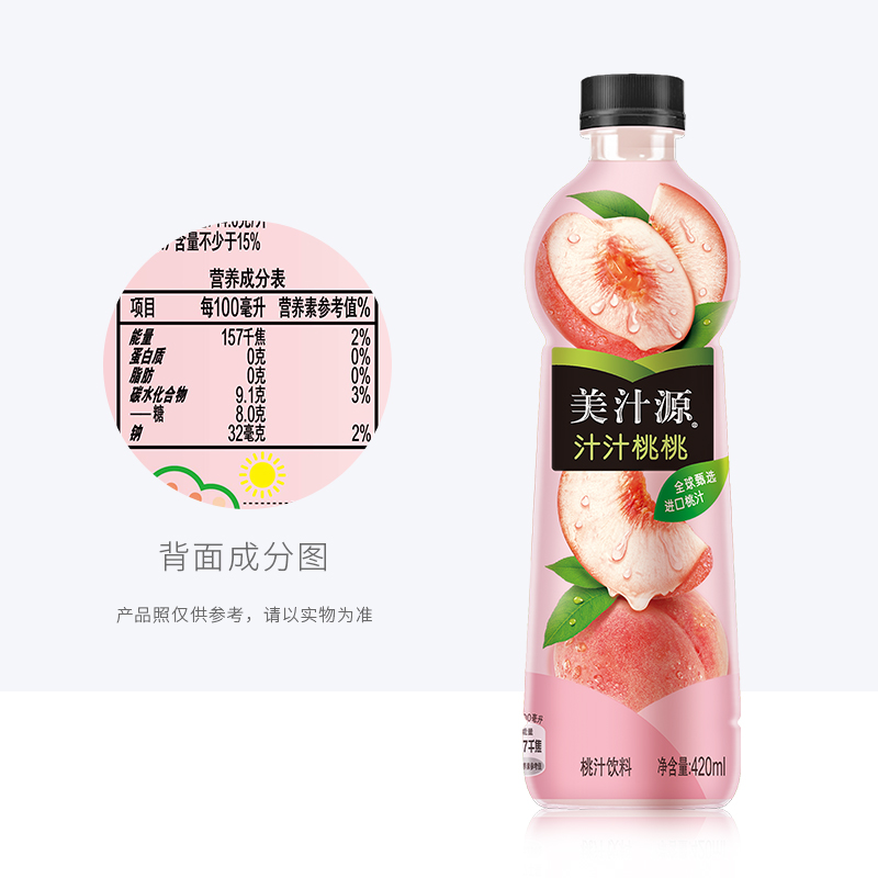 美汁源是可口可乐旗下品牌,美汁源的果汁饮料起源于1945年,产品分销全球100多个国家,成为了享誉全球的知名果汁品牌。“美汁源”品牌的全球产品结构形成了由果汁、果汁饮料和其他的健康饮品组成的产品系列。香甜蜜桃,手工轻摘,汁汁浓郁,口感醇厚~规格:420ml*12瓶。美汁源是可口可乐旗下品牌,美汁源的果汁饮料起源于1945年,产品分销全球100多个国家,成为了享誉全球的知名果汁品牌。“美汁源”品牌的全球产品结构形成了由果汁、果汁饮料和其他的健康饮品组成的产品系列。香甜蜜桃,手工轻摘,汁汁浓郁,口感醇厚~