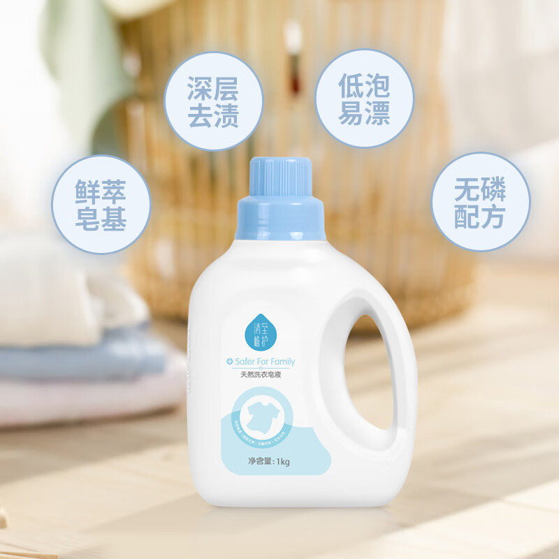洗衣皂液,有别于传统洗衣液,含皂基活性成分,洁净效果加倍。低泡易漂,泡沫适中,易漂清不易残留,节水易冲洗。温和洁净,含植物皂角成分,植物洗衣不刺激。净护配方,为婴研制,呵护新生。清新淡香,让衣物持久留香。