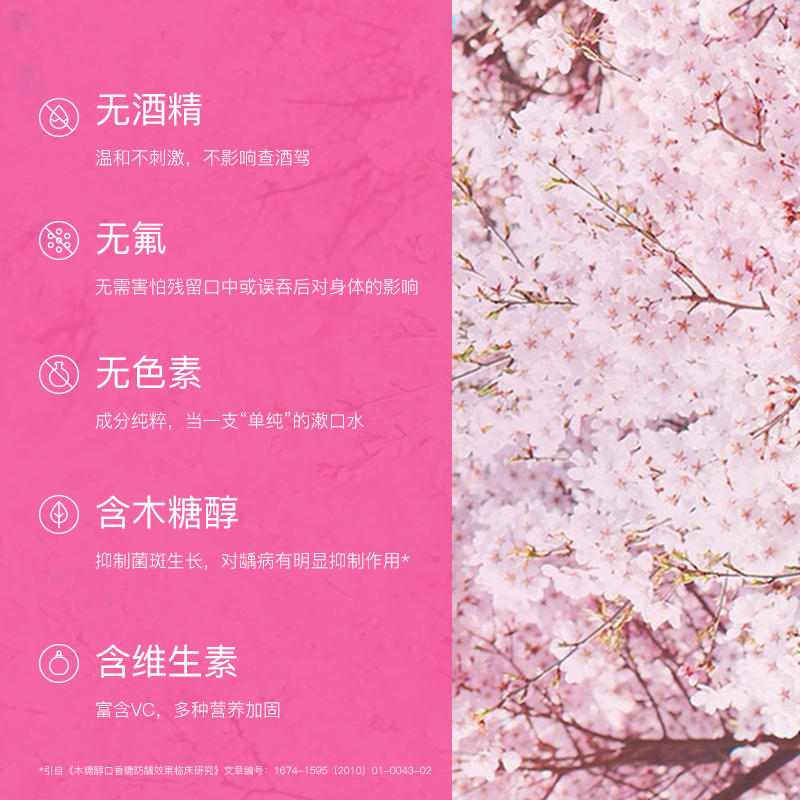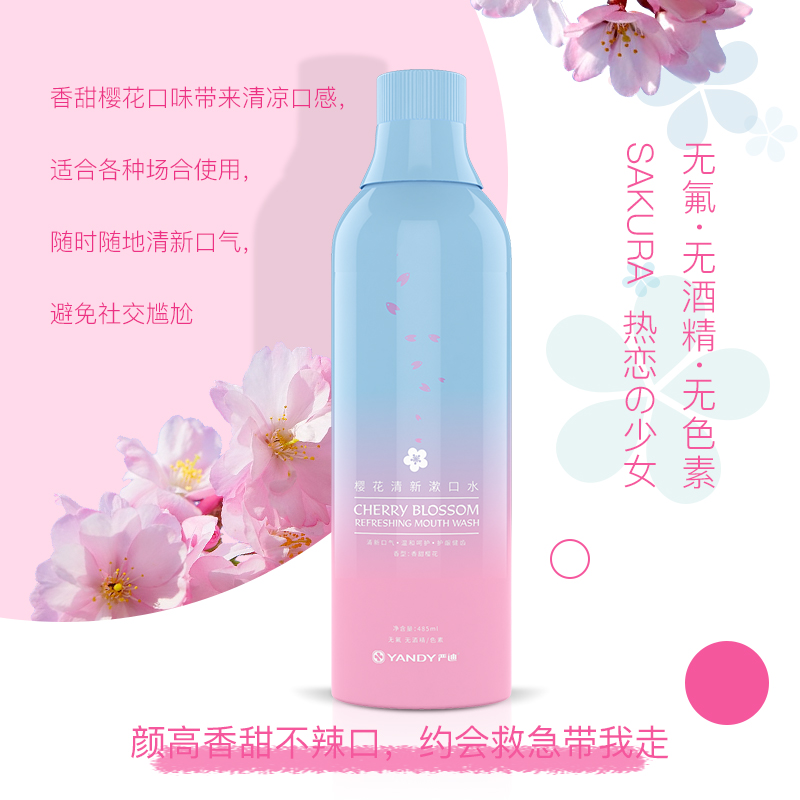 这款YANDY 严迪 樱花清新 漱口水,无酒精,温和不刺激,不影响查酒驾;无氟,无需害怕残留口中或误吞后对身体的影响;无色素、成分纯粹,当一支“单纯”的浓口水;含木糖醇,抑制菌斑生长;含维生素、富含VC,多种营养加固。