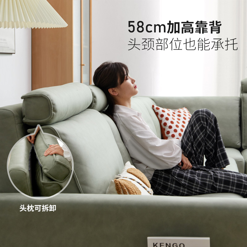 双人位与单人位自带头枕,可承托头颈以上位置,搭配 106°倾斜式角度,紧密贴合背部曲心,护颈撑腰,让劳累 的脊椎也能得到更好的放松。贴合颈部与手部曲线,倚靠看书,枕睡都舒适。 扶手置物袋,书本、遥控器可放,饱满坐靠感,舒适度内外兼修。