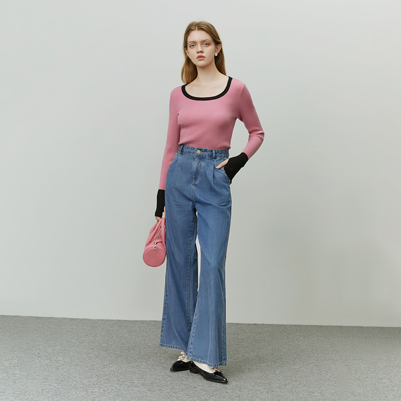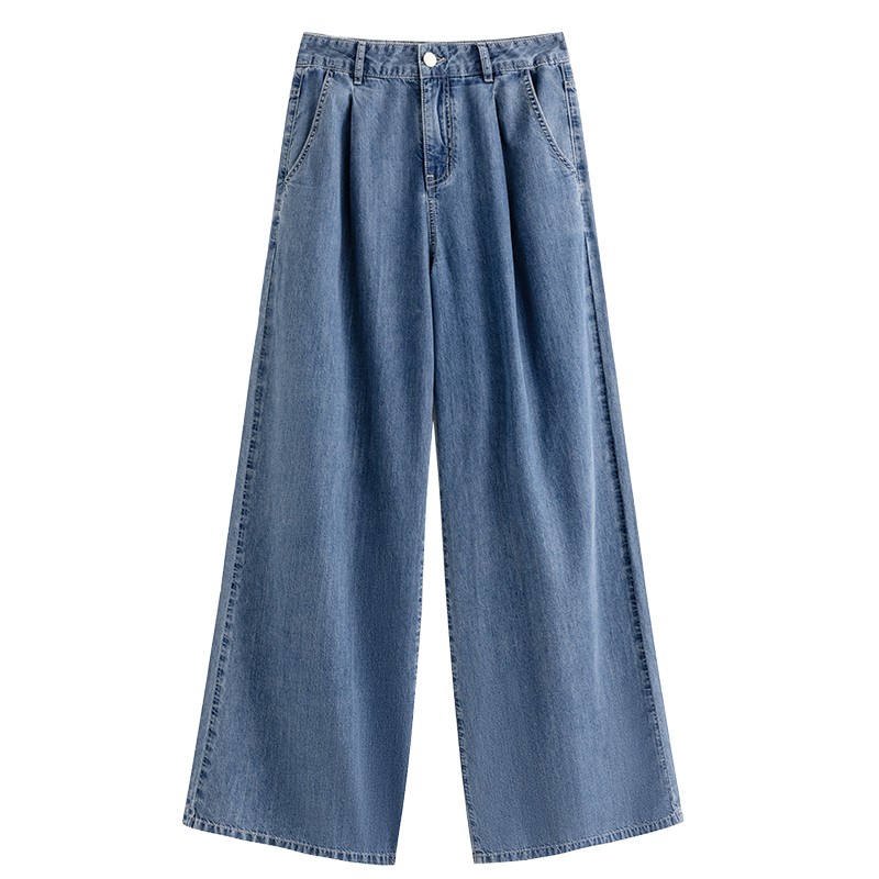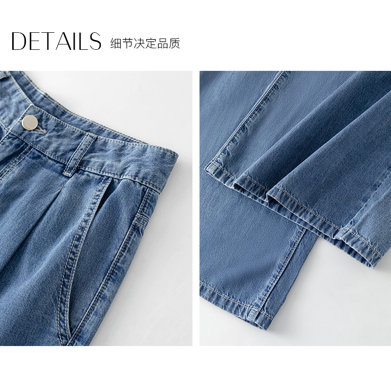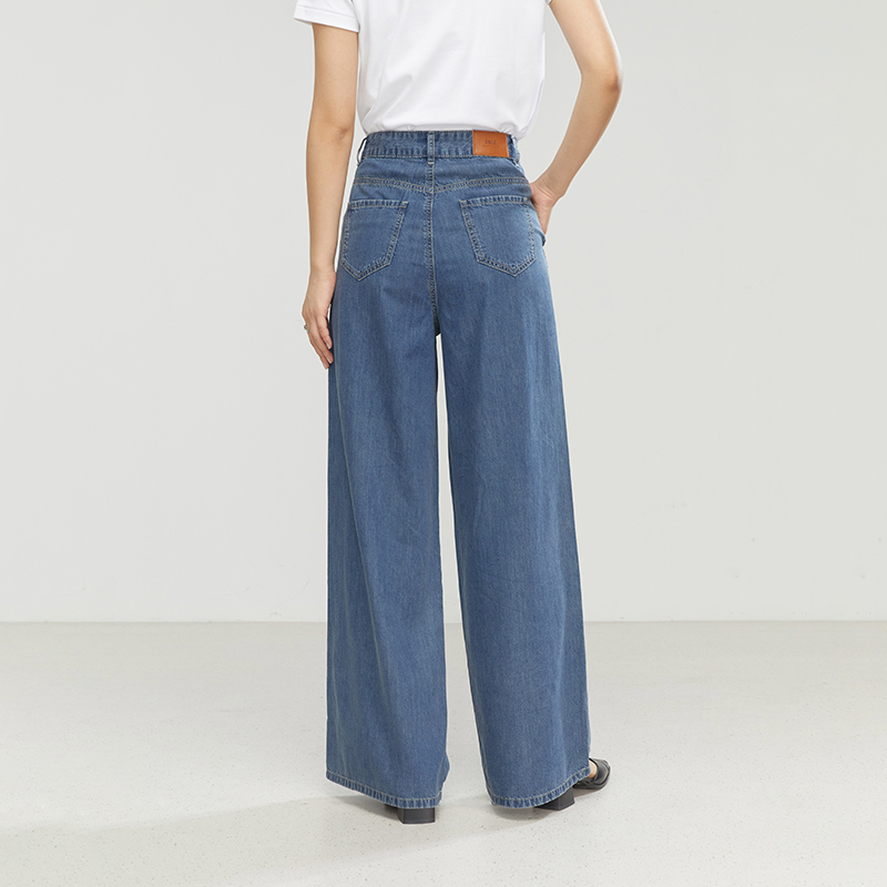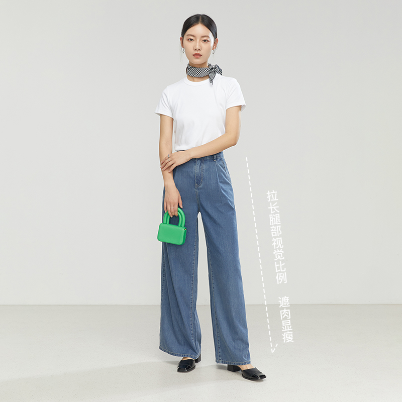 FANSILANEN 范思蓝恩 女士高腰天丝牛仔裤 22FS2842,高腰阔腿设计,视觉抬高腰线,质地柔软,上身舒适不紧绷,细腻也很亲肤。