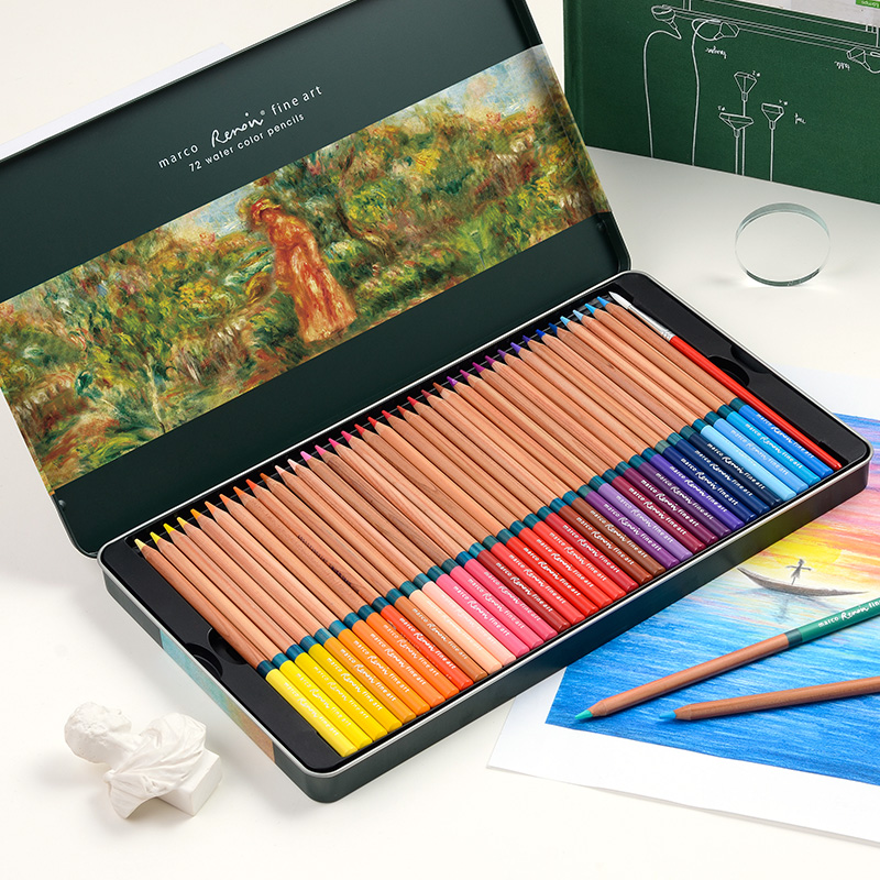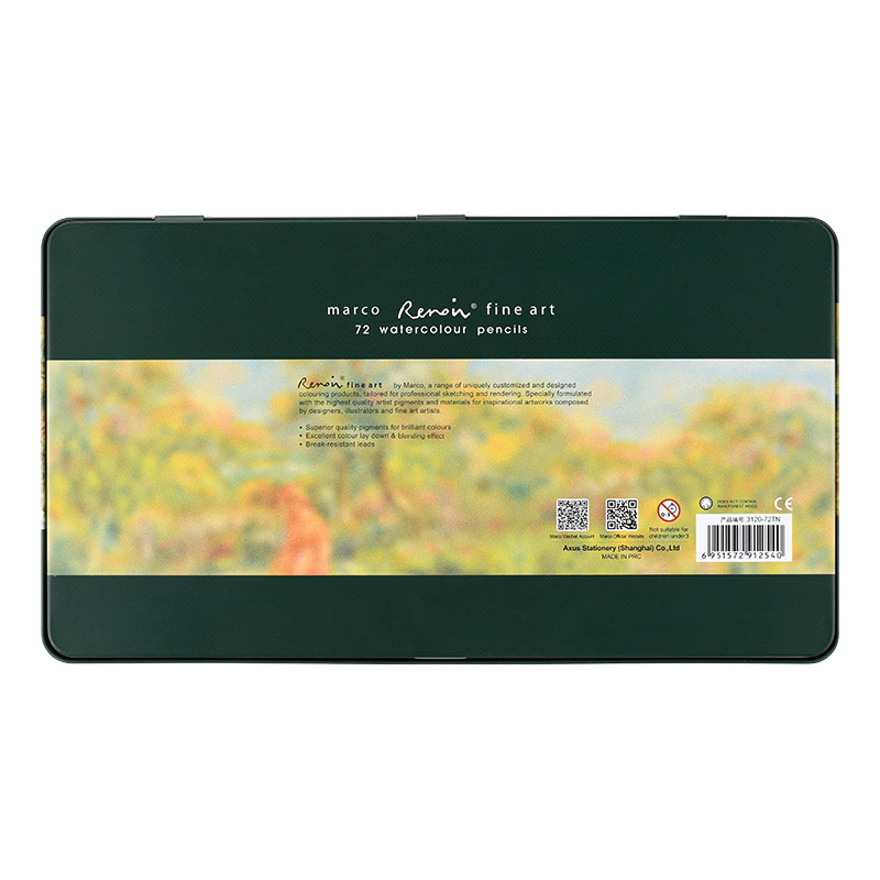 MARCO为安硕文教用品(上海)股份有限公司旗下产品,是国内比较知名的铅笔生产企业。此款3120-48TN水溶性彩色铅笔为雷诺阿系列,属于马可比较高端的系列,采用优质石墨,不易折断色彩鲜艳,木质笔杆,采用100%原木,此款套装总共48色,铁盒装。
