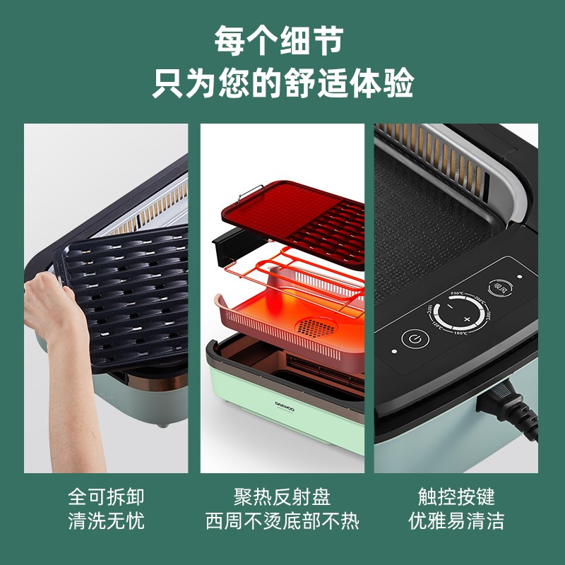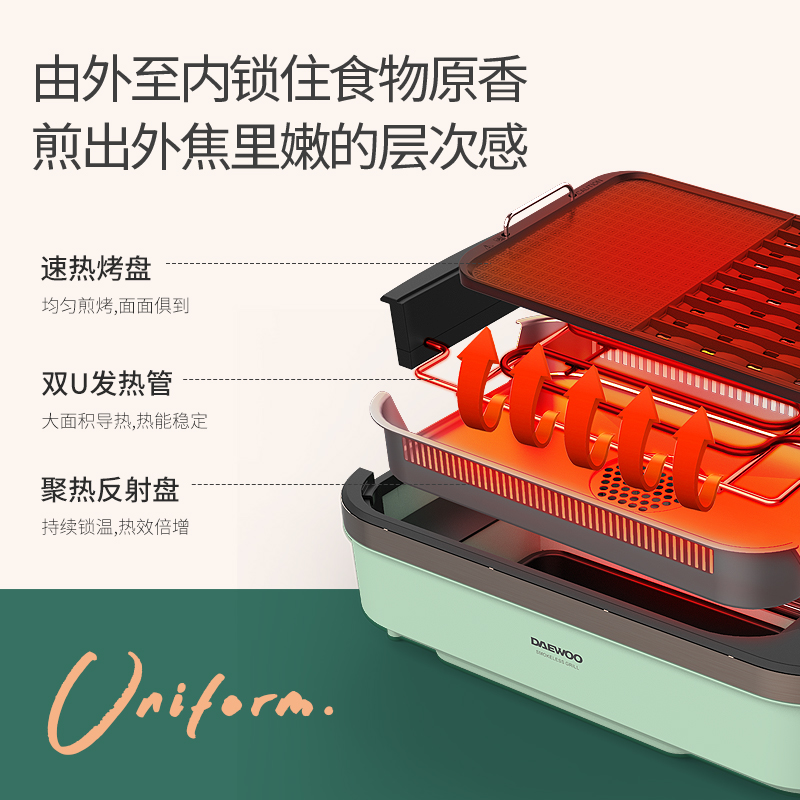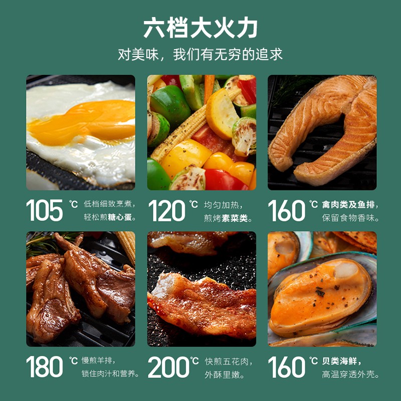快速均匀传热由外至内锁住食物原香。非远红外加热,食物接触恒温烤盘,表层首先焦化,食物的营养、水分及风味被锁住,自然分层、口感饱满。40个导油孔滤掉多余油脂,烧烤时食物多余的油脂从导油孔流入接油盘,避免老油反复浸润煎炸,美味健康不油腻。