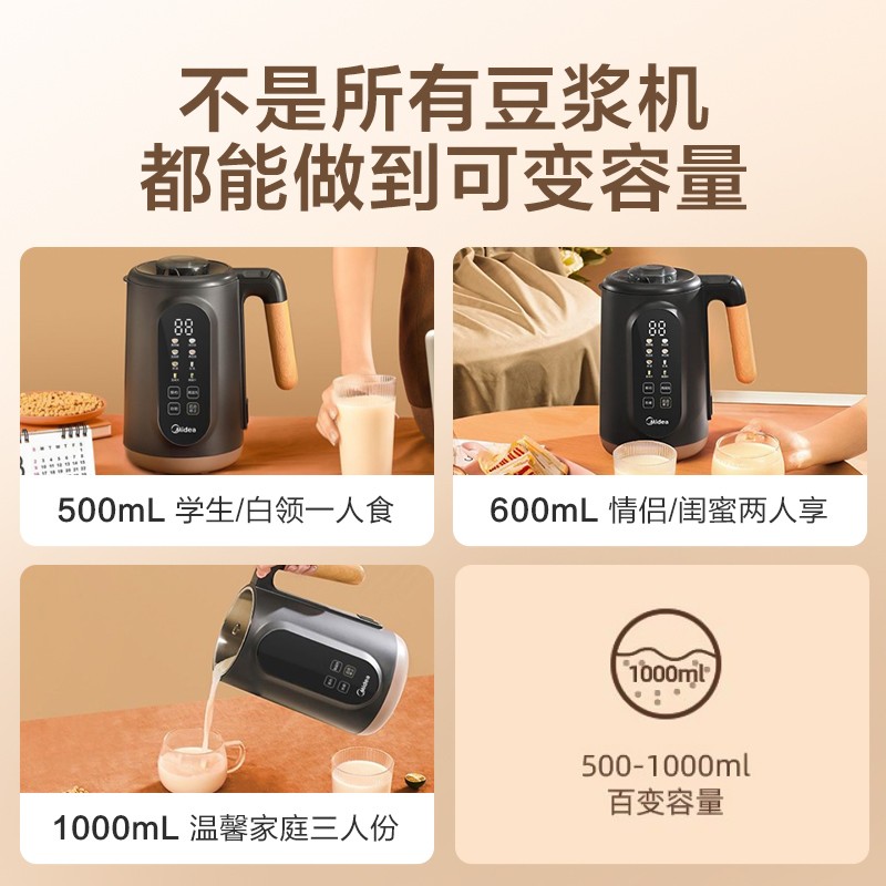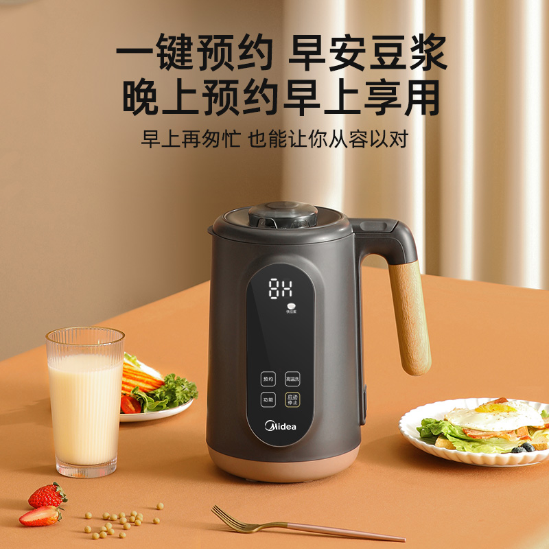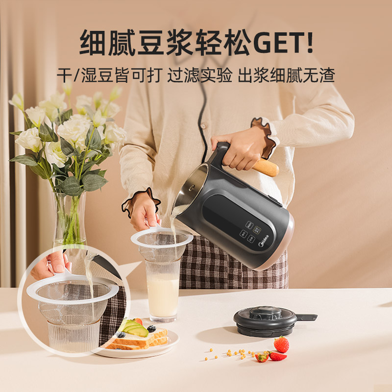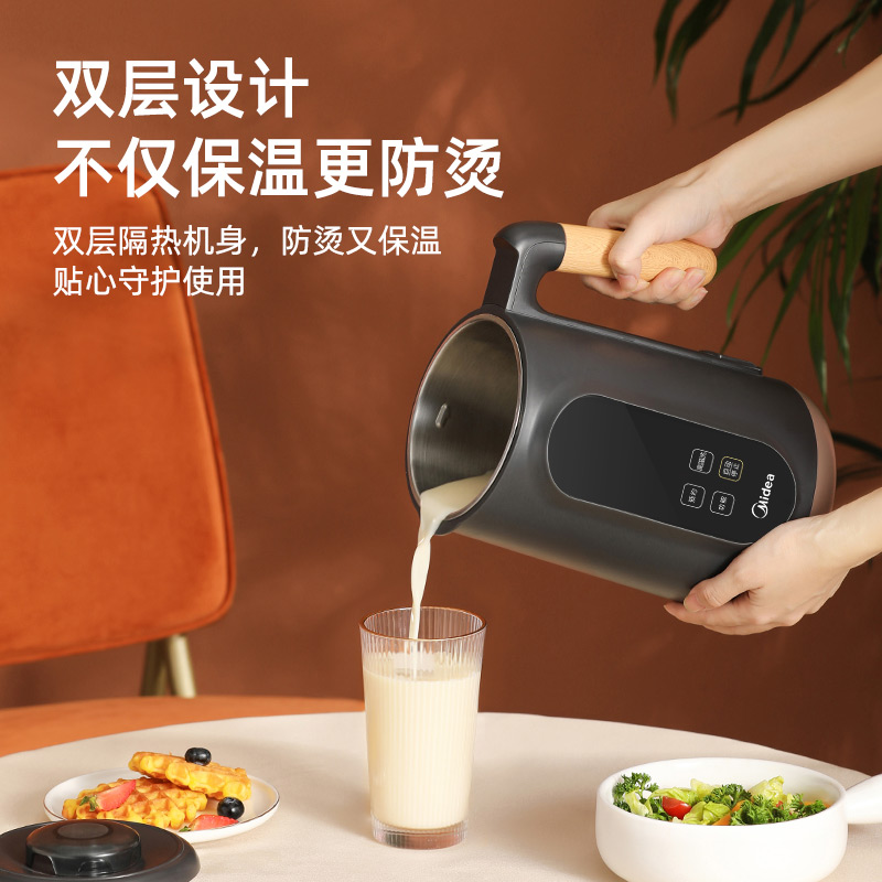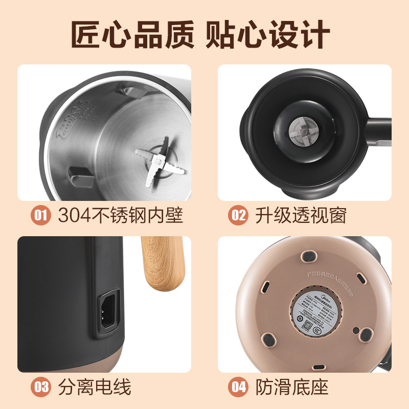 美的(Midea)这款小型豆浆机,机身双层结构设计,保温防烫手。内壁选用食品接触用304不锈钢材质制作,具有耐高温、抗腐蚀的特点。内置四叶刀头,使用时刀头漩涡式搅打,破壁速度快,打磨细腻。上盖设有透明视窗,可观察食材搅拌情况。
